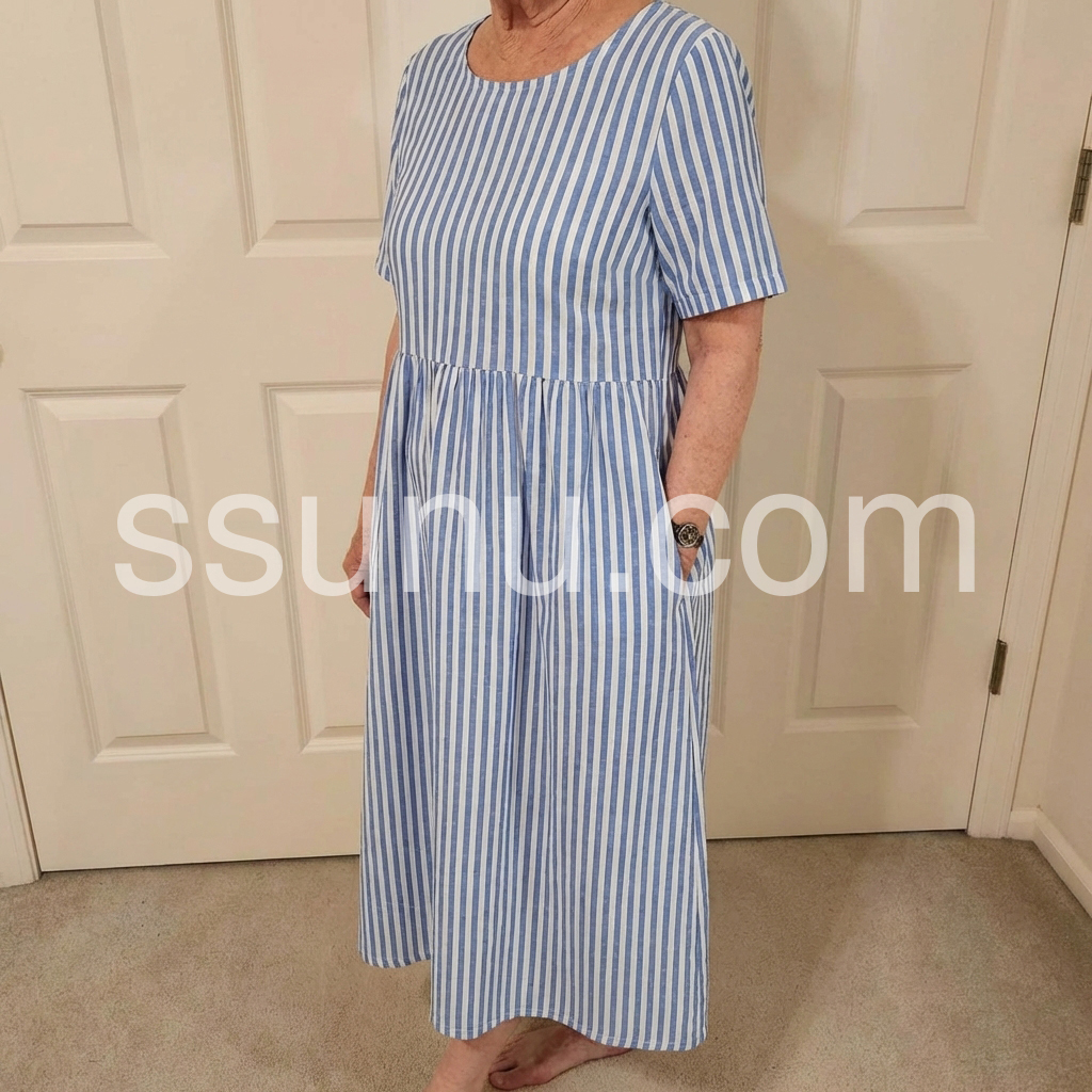 The relaxed empire waist, flowy A-line skirt, and short sleeves offer ultimate comfort and a flattering silhouette. Functional side pockets add practical luxury to the minimalist design.