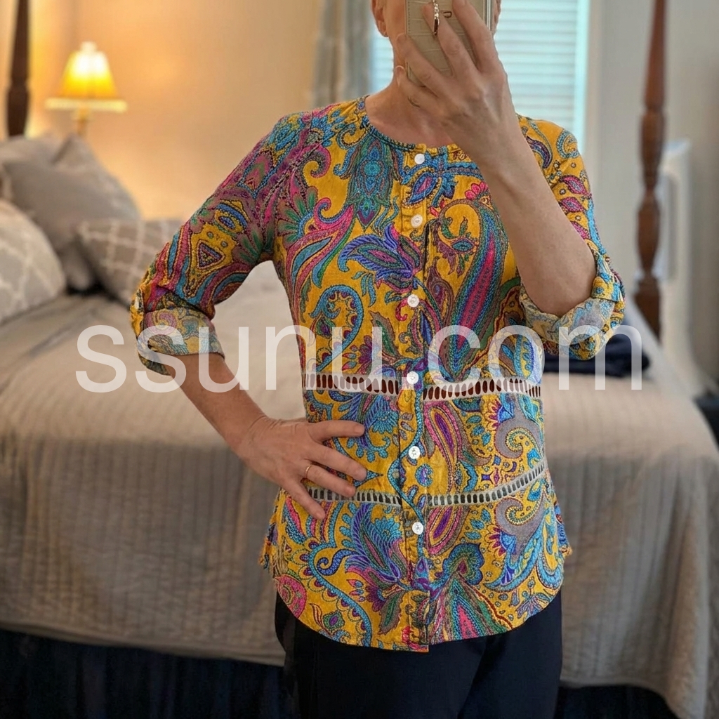 This long-sleeve tunic features a rich yellow base with colorful paisley patterns. The front button design adds vintage charm. Relaxed fit and rolled sleeves for comfort. Perfect for casual wear or bohemian styles. Pair with jeans or leggings for effortless flair.