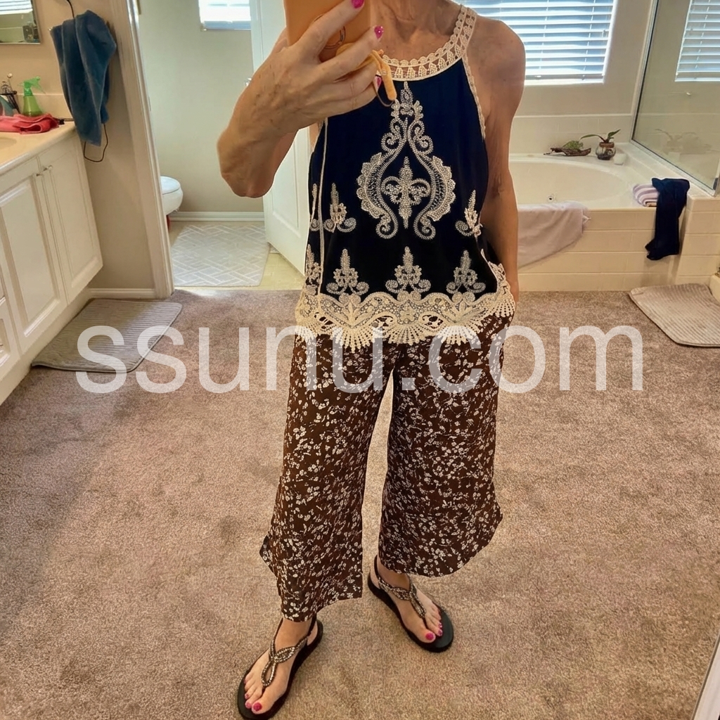 These high-waisted culottes feature a delicate white floral print on a rich brown base. Wide-leg design with an asymmetrical hem for a stylish flair. Elastic waistband for comfort and ease. Lightweight fabric perfect for warm weather. Ideal for casual outings or boho-chic looks.
