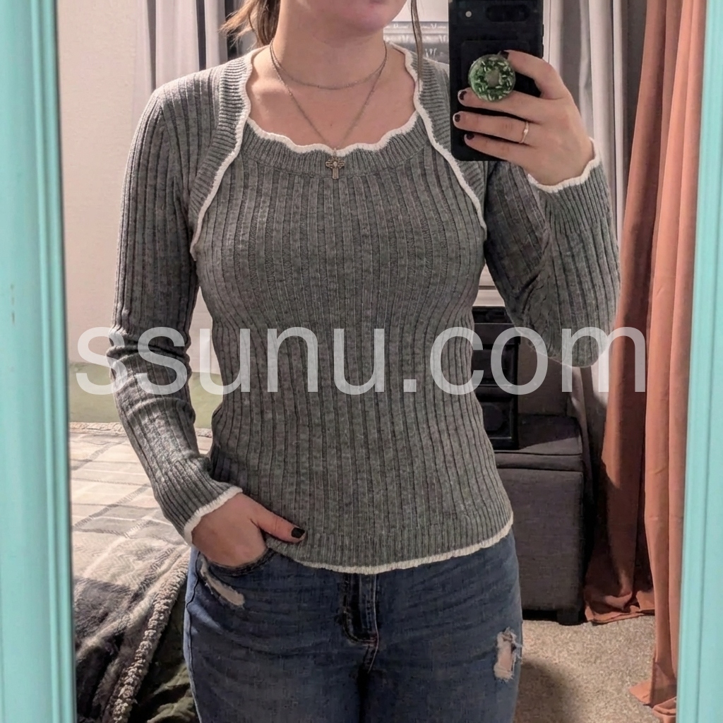 Grey Square Neck Long Sleeve Sweater
