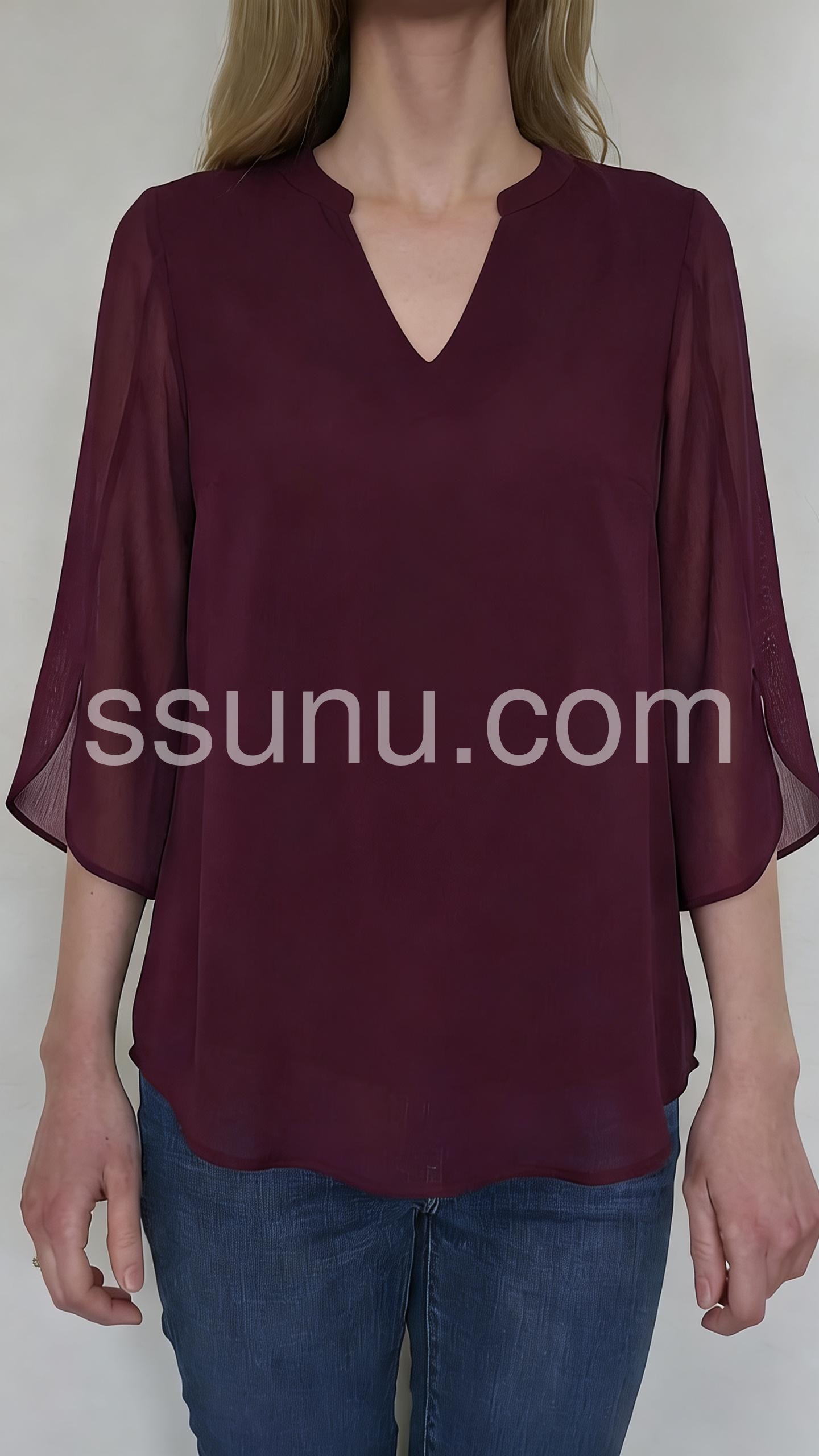 Burgundy 3/4 Sleeve Plain Chiffon Top