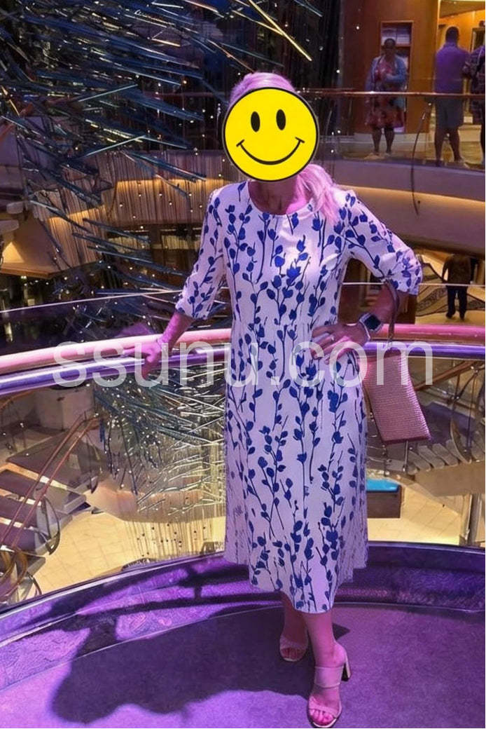 Style# 1544426Embrace the serenity of seaside living in this Coastal Blue Botanical Print Midi Dress, a dreamy and elegant piece that captures the essence of Mediterranean charm. Crafted from lightweight, breathable fabric—likely cotton or linen blend—this midi dress features a crisp white base adorned with a delicate all-over print of navy blue leafy vines and botanical sprigs, evoking the beauty of coastal flora. The relaxed A-line silhouette flatters every figure, while the high waist and gentle gathering create a soft, flowing shape that moves gracefully with you. Short sleeves and a round neckline offer timeless comfort and ease, perfect for warm days by the sea. Designed with functional side pockets, it’s both stylish and practical—ideal for strolls through whitewashed villages, beachside brunches, or summer vacations.