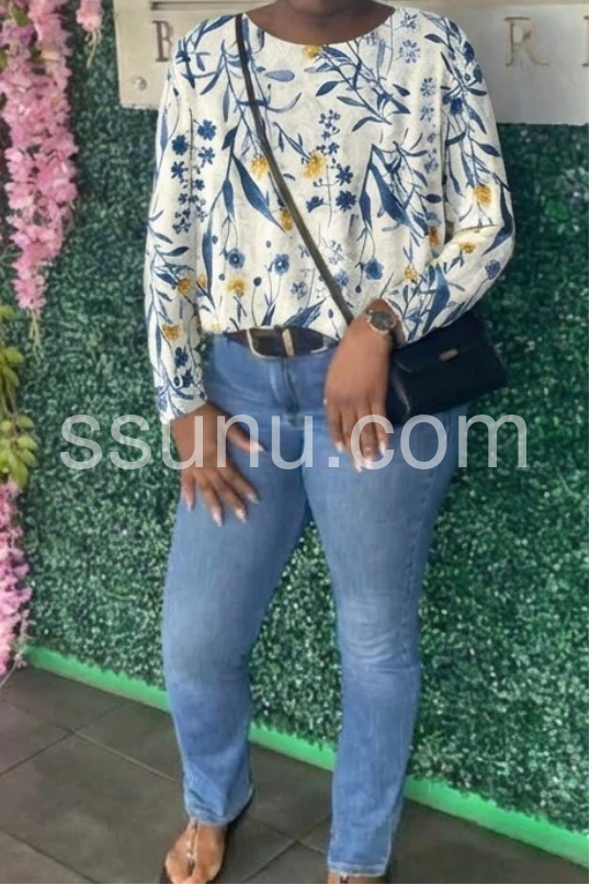 Trendy Blue Floral Round Neck Top