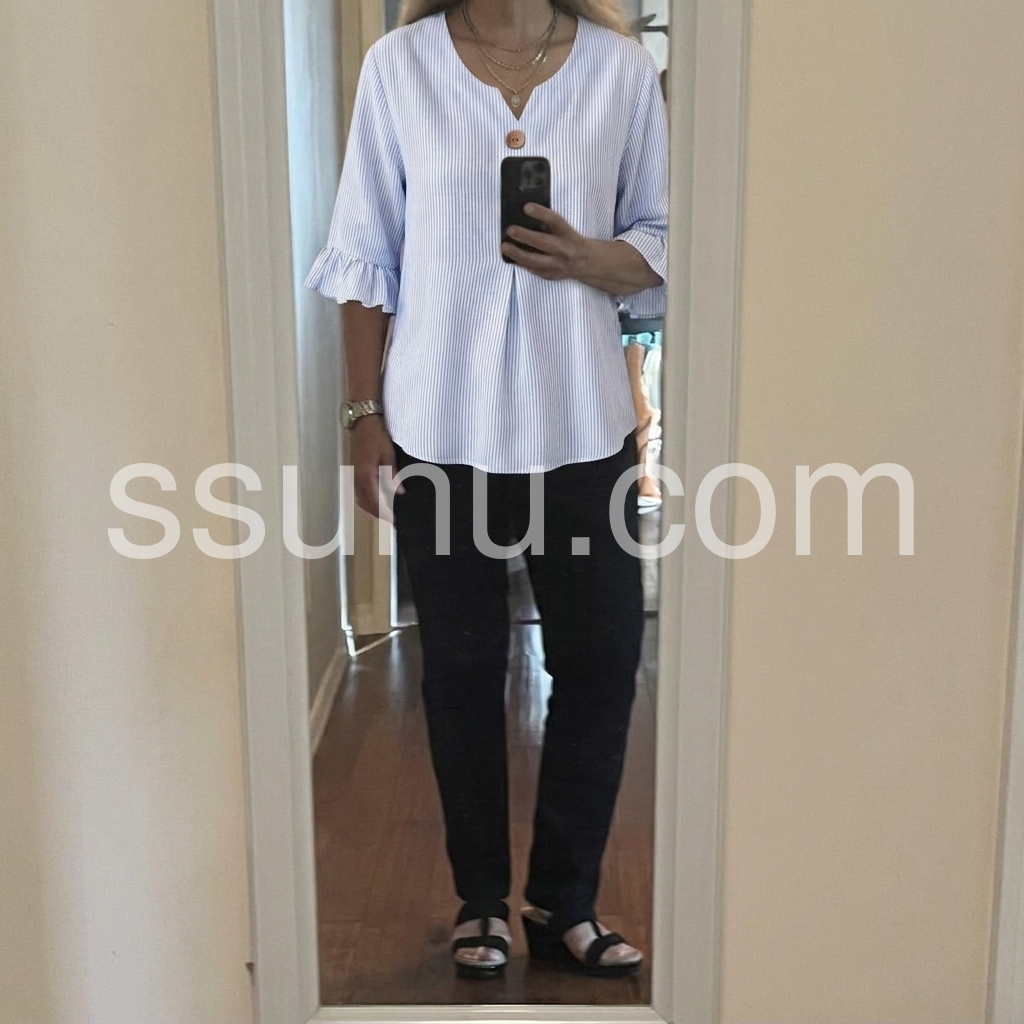 As a designer, I crafted this blouse to solve the common pain point of "too casual or too formal" daily tops. The notched V-neck flatters all necklines, while the ruffled cuffs add a feminine touch without being overly frilly.
