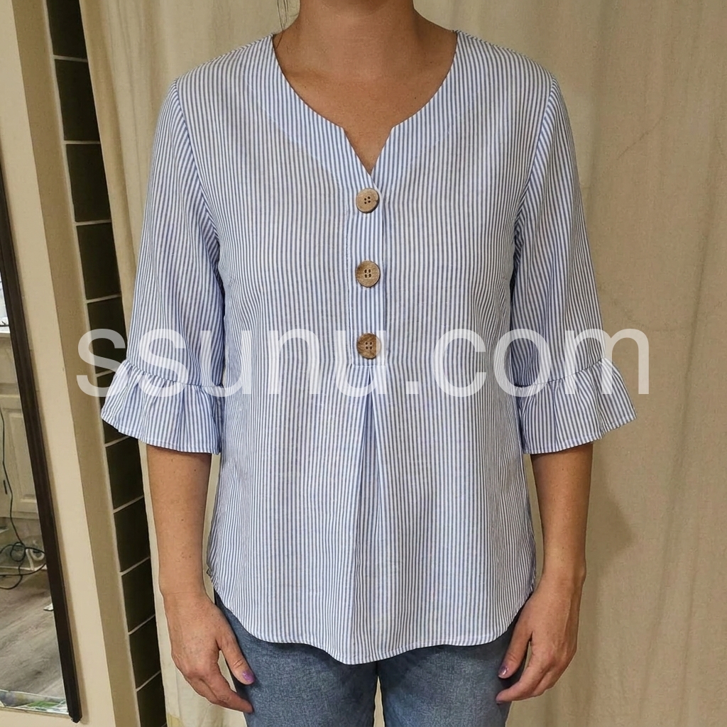Blue Stripe Ruffle Sleeve V-Neck Blouse