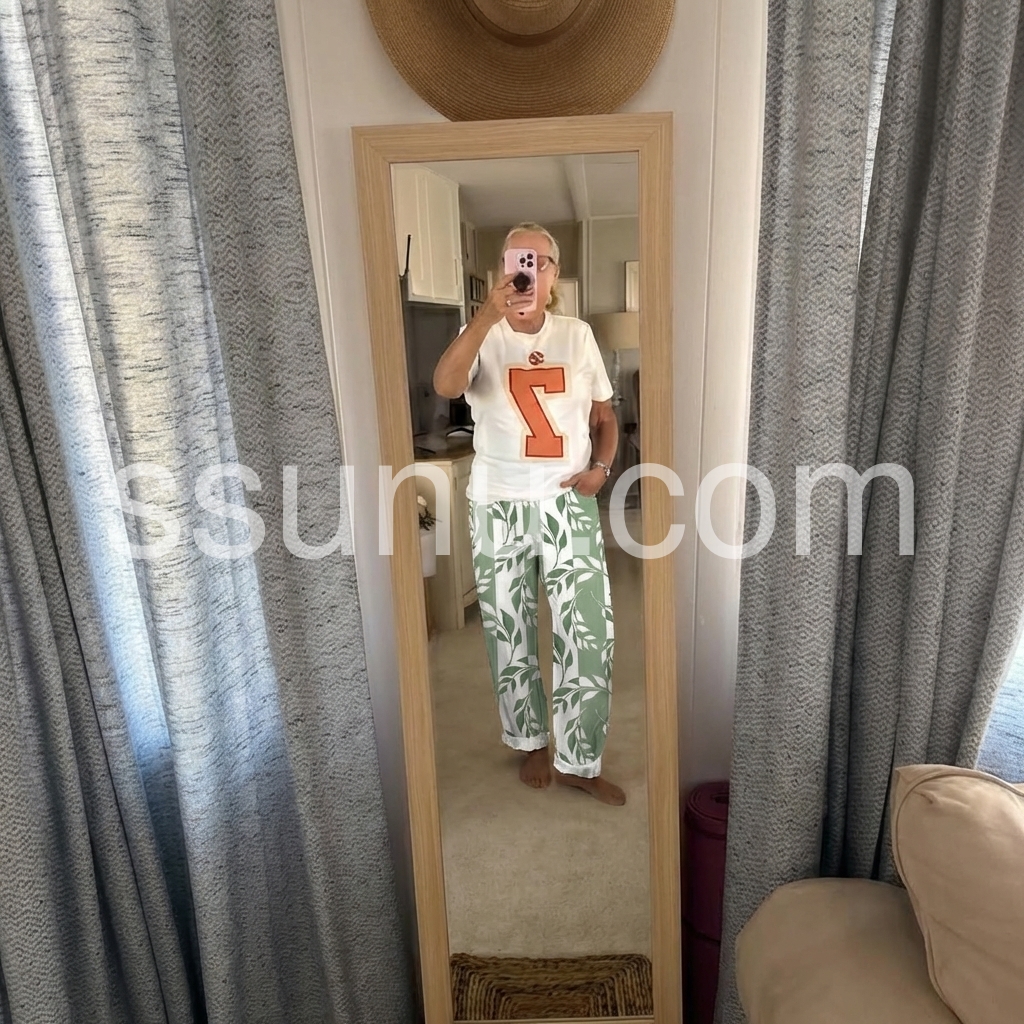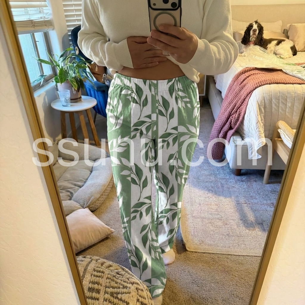 These loose-fit pants feature a soothing green and white leaf pattern. Side button details add a stylish touch. Elastic waistband and cuffed hems for comfort. Lightweight fabric perfect for warm weather. Ideal for beach days or casual outings.