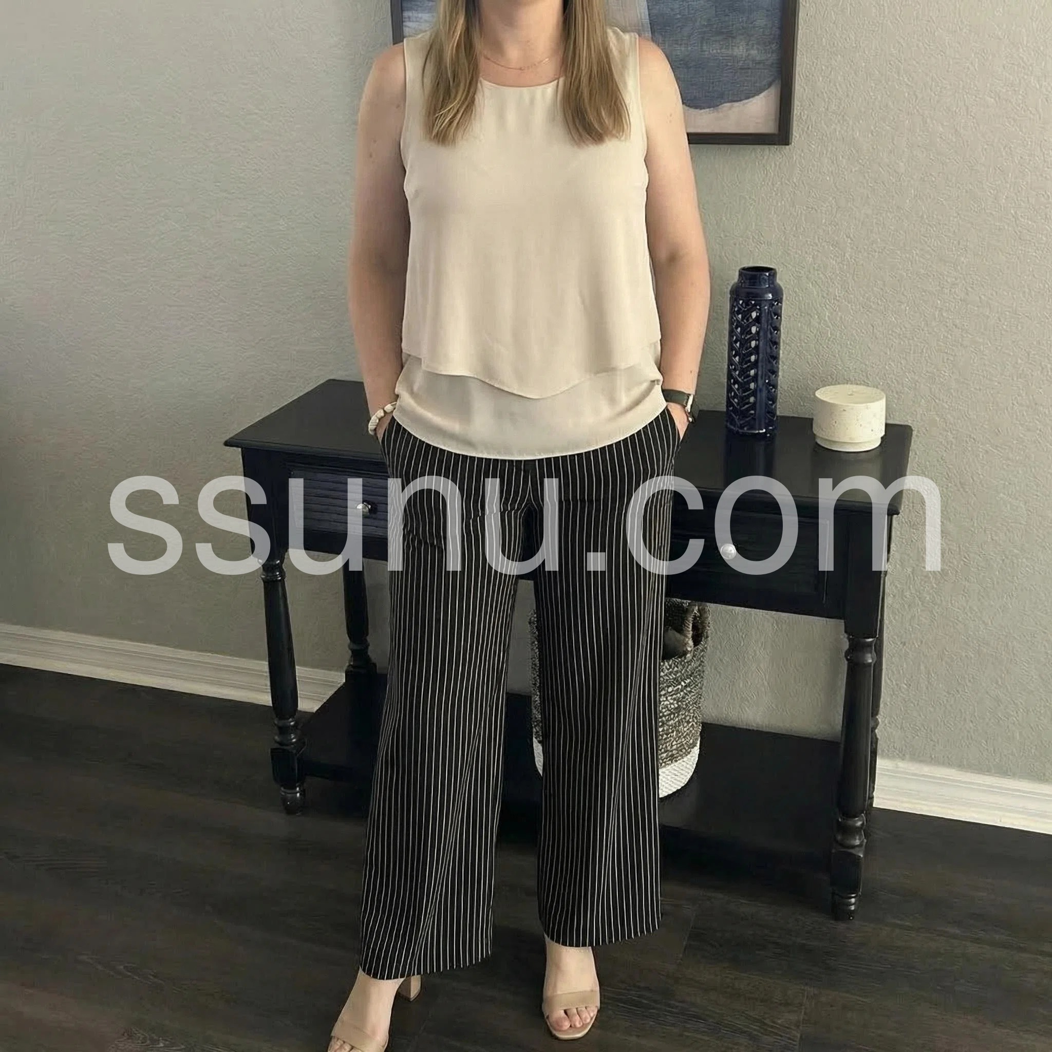 This two-piece set features a sleeveless beige top with a layered hem and square neckline. Paired with high-waisted black wide-leg pants in thin white stripes. Comfortable fit with a chic, relaxed silhouette. Perfect for casual outings or smart-casual events. Effortlessly stylish and easy to wear.