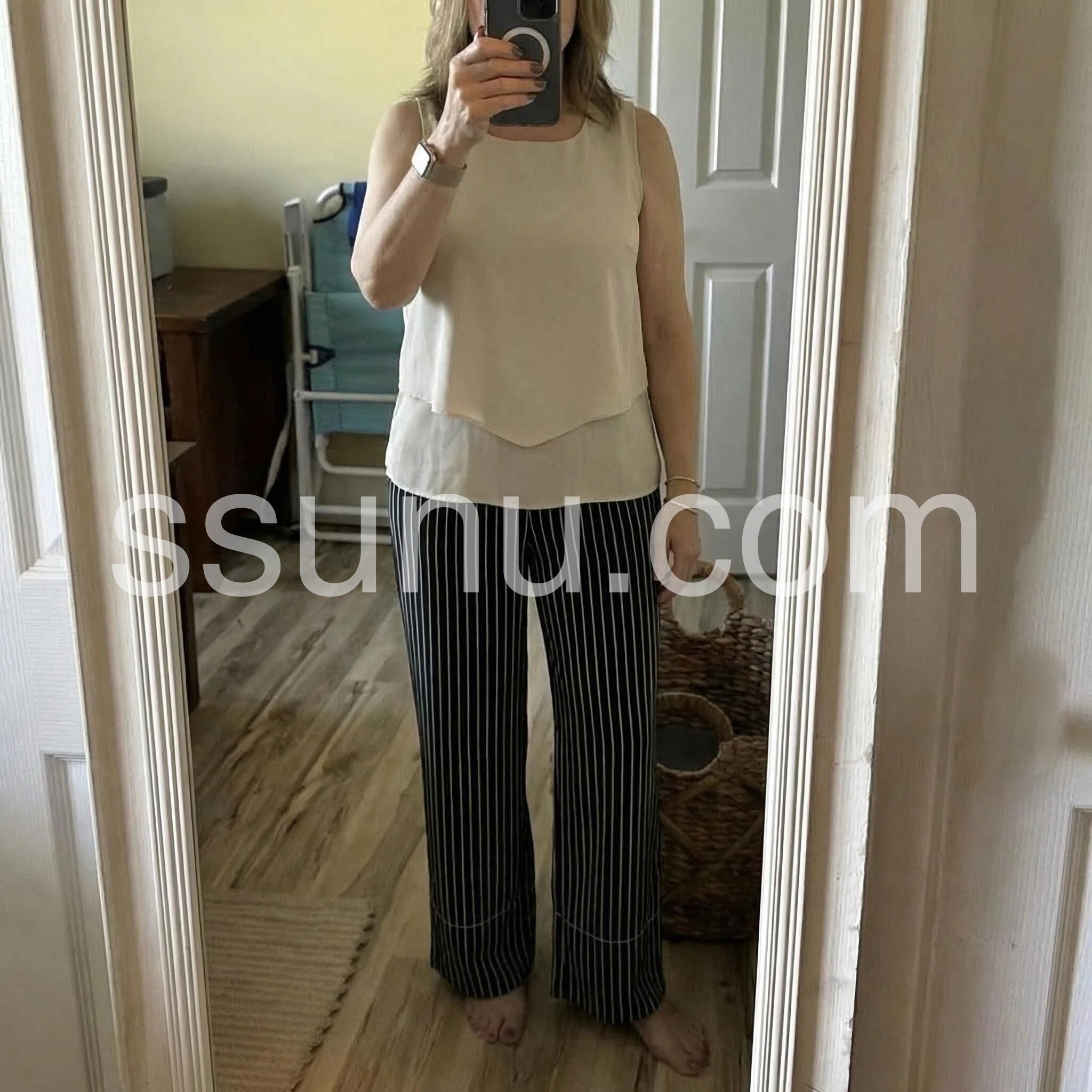The vertical stripes on these wide-leg pants are incredibly slimming and make me look taller. The contrasting cream top balances the whole look beautifully.