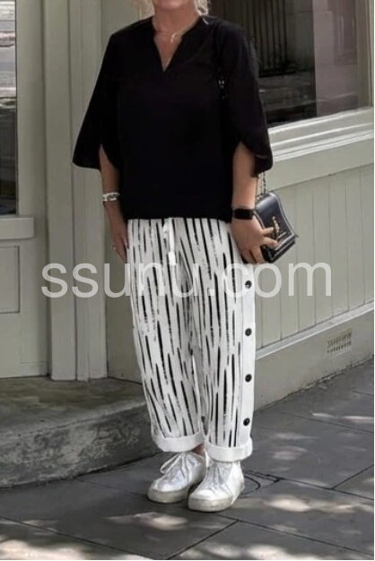 These relaxed-fit pants feature a bold black abstract stripe print on a white base. Elastic waistband and cuffed hems offer a cozy, stylish look. Side button details add a unique touch. Lightweight fabric perfect for casual wear. Effortlessly chic with a contemporary edge.