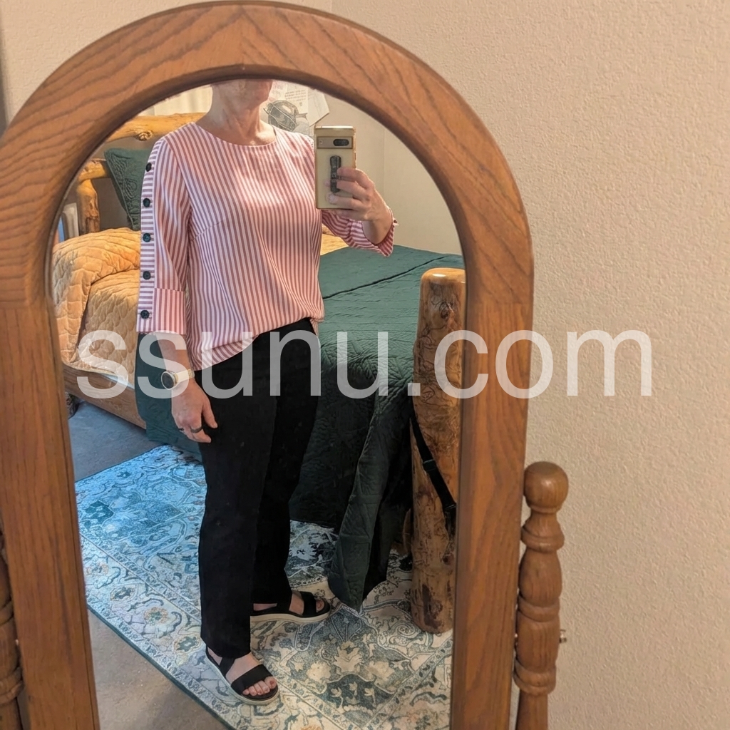 his loose-fit top features vertical pink and white stripes with stylish button details on the sleeves. Three-quarter sleeves with rolled cuffs offer a relaxed look. Round neckline for a clean, comfortable fit. Perfect for casual wear or smart-casual outfits. Bright and cheerful with a touch of elegance.