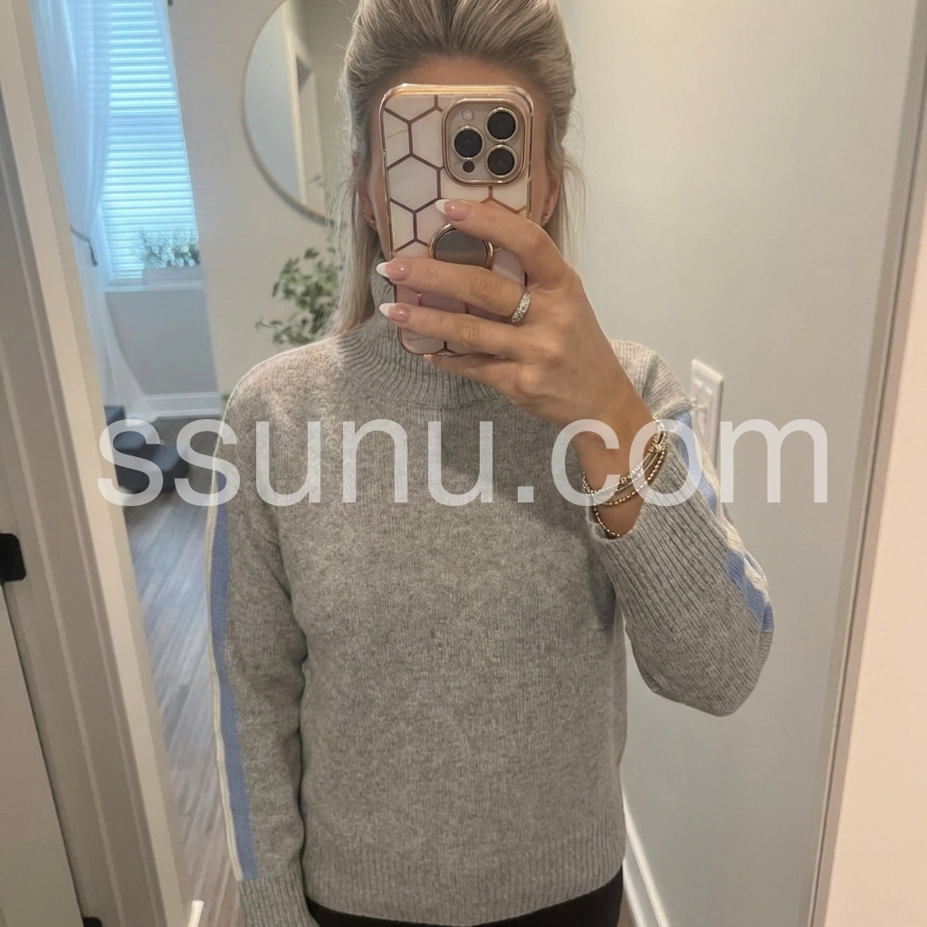 When I first received this grey sweater I wasn't sure if I liked it. One I tried it on I did like it. It fits well and I liked the design of the sweater. I like the high-neck, which isn't too cold. The sweater is comfortable and lightweight for cool days. I think it is a good value for the price.