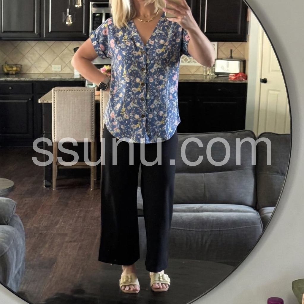 This short-sleeve V-neck blouse features a delicate floral print on a deep navy background. The button-down front adds a polished touch. Lightweight fabric perfect for warm weather. Pair with jeans or skirts for effortless style. Ideal for casual outings or spring days.