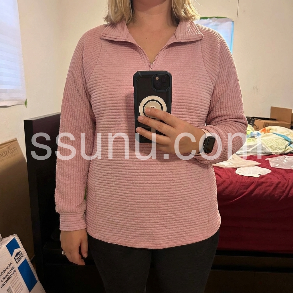 This dusty pink half-zip sweatshirt is my new favorite casual piece! The ribbed texture feels so soft and structured, not bulky at all. The quarter-zip neckline is perfect for adjusting warmth, and the relaxed fit drapes beautifully over jeans. I wore it all day running errands and it stayed comfortable, no scratchy fabric. The muted pink is such a chic, wearable color—goes with everything in my closet!