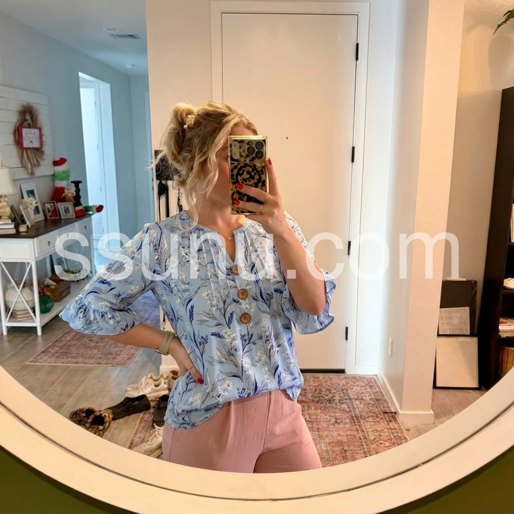 The V-neck, pleated front, and ruffle cuffs add refined detail, while the relaxed fit offers all-day comfort.