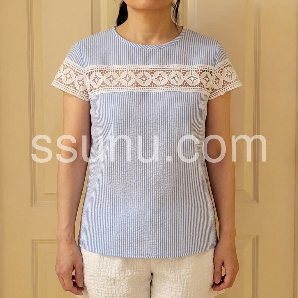 This short-sleeve top features a delicate white lace panel across the chest and sleeves. Made from soft, textured fabric with vertical stripes for a subtle pattern. Perfect for casual summer days or beach outings. Pair with shorts or jeans for a stylish look. Effortlessly chic and breathable.