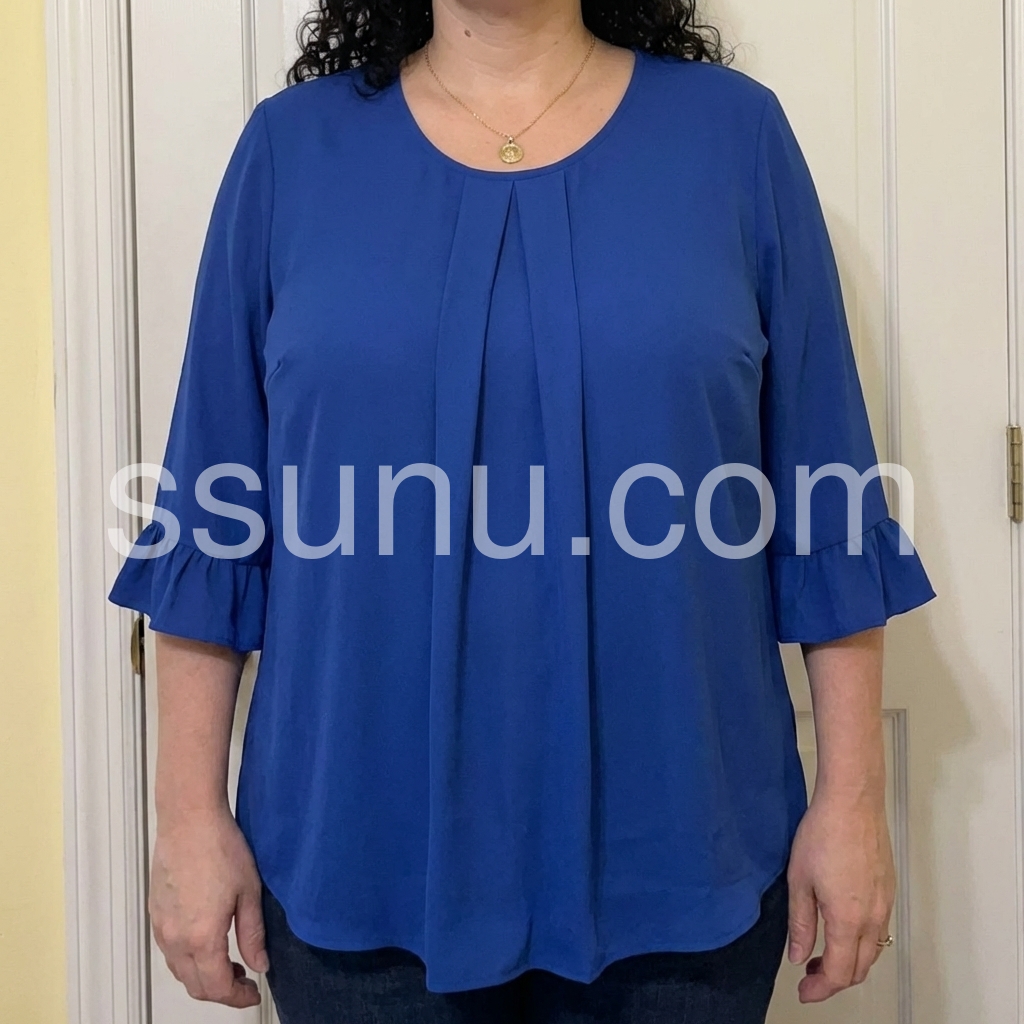 Elevate your everyday style with this gorgeous royal blue blouse. It features delicate front pleats and flirty ruffled cuffs, adding a touch of elegance to your look.