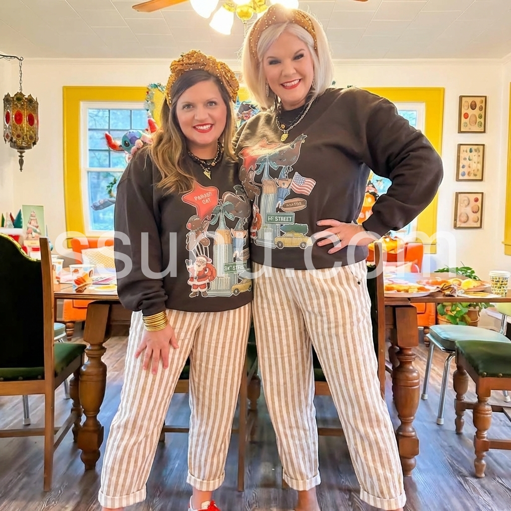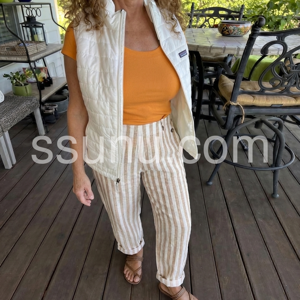 These loose-fit pants feature vertical beige and white stripes for a classic look. Elastic waistband with side button detail and cuffed hems. Lightweight fabric perfect for warm weather. Comfortable and stylish for casual wear. Ideal for beach days or relaxed outings.