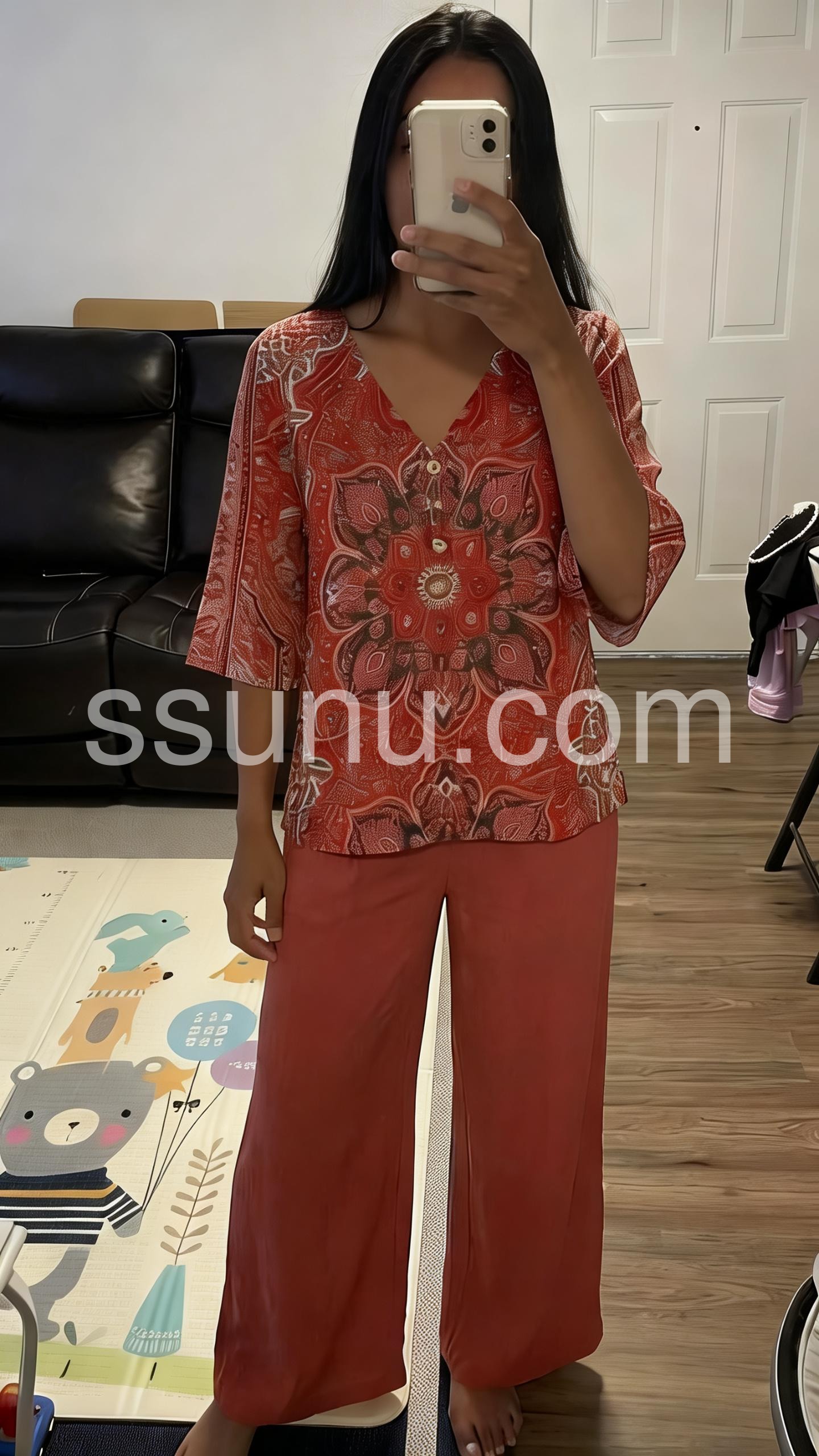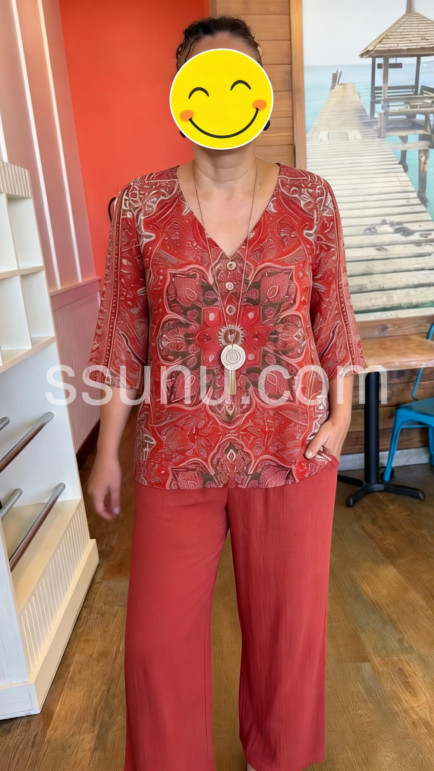 This coordinated set features a V-neck top with a bold mandala print and matching solid wide-leg pants. The relaxed fit ensures all-day comfort. Soft fabric perfect for warm weather. Ideal for casual outings or stylish days out. Effortlessly chic with a bohemian flair.