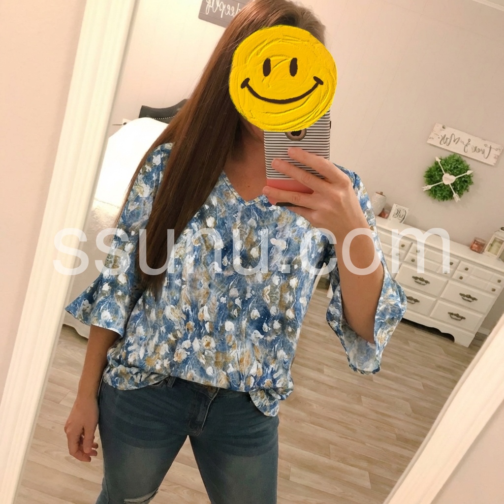 Blue Floral Ruffle Sleeve V-Neck Blouse