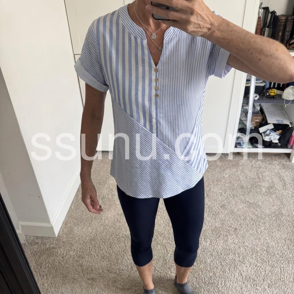 This short-sleeve top features vertical blue and white stripes. V-neckline with front buttons and a stylish wrap design. Cuffed sleeves add a polished touch. Lightweight and perfect for casual wear. Ideal paired with jeans or trousers.