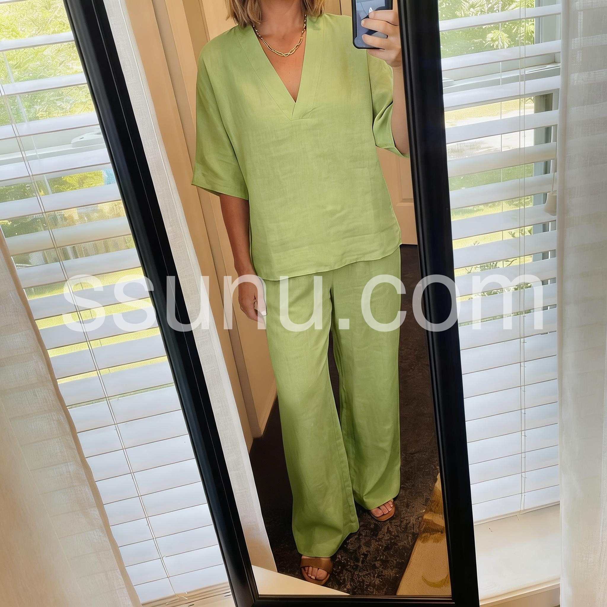 This coordinated set features a relaxed V-neck top and wide-leg pants in soft, breathable linen. The solid lime green hue offers a fresh, natural look. Perfect for warm weather and casual wear. Ideal for beach days or effortless everyday style. Comfortable and elegantly simple.