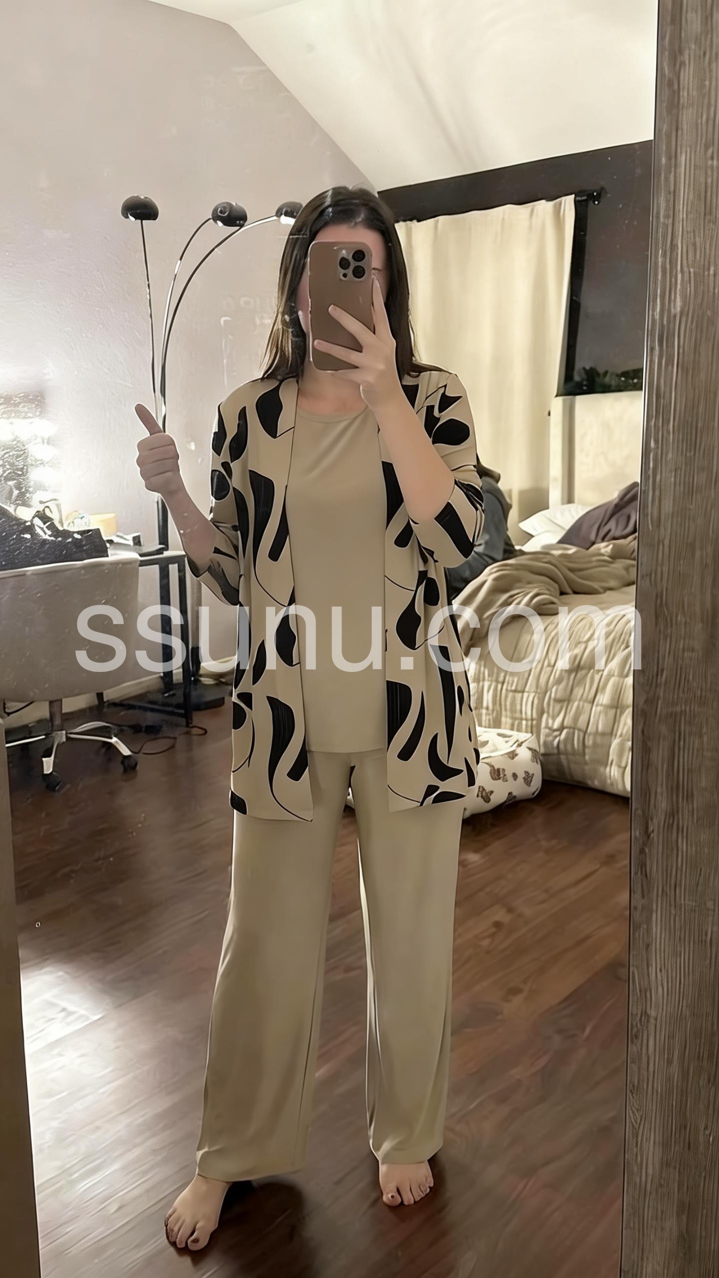 This coordinated set includes a round-neck top, relaxed wide-leg pants, and a matching open-front cardigan in soft brown tones. Made from comfortable, lightweight fabric ideal for everyday wear. The minimalist design offers effortless elegance. Perfect for casual outings or relaxed days at home. Stylish, versatile, and easy to layer.