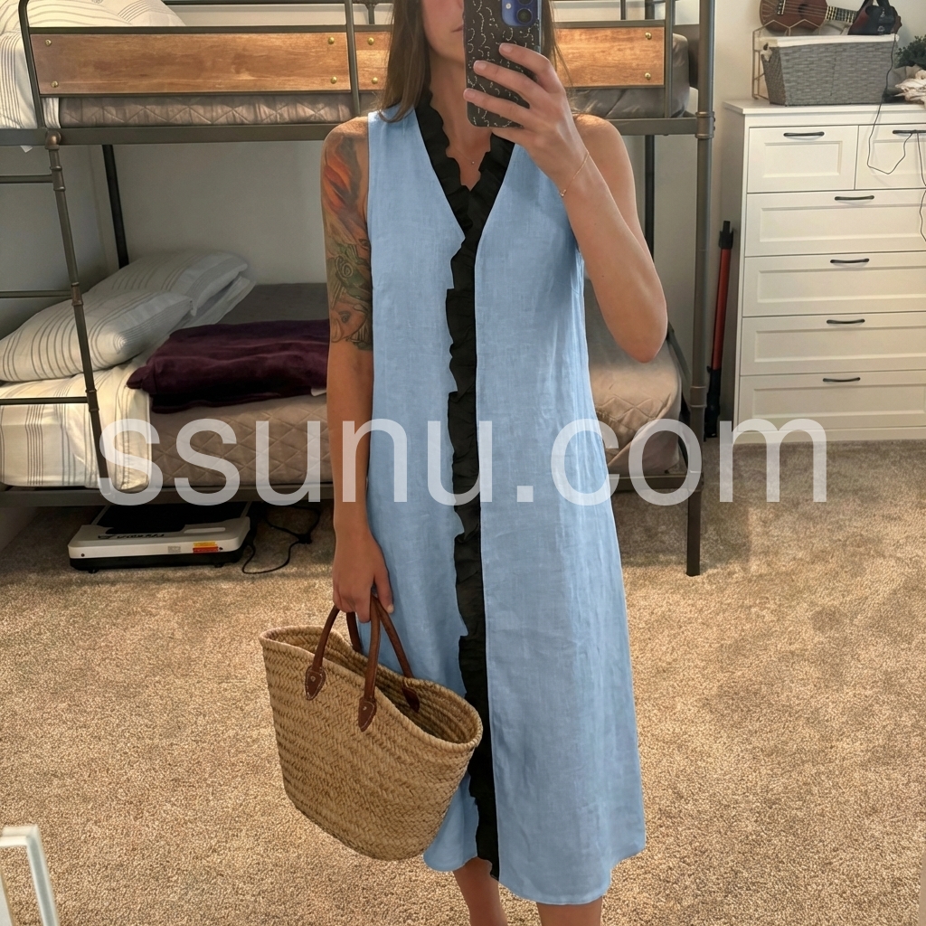 Sky Blue Black Ruffle Sleeveless Midi Dress