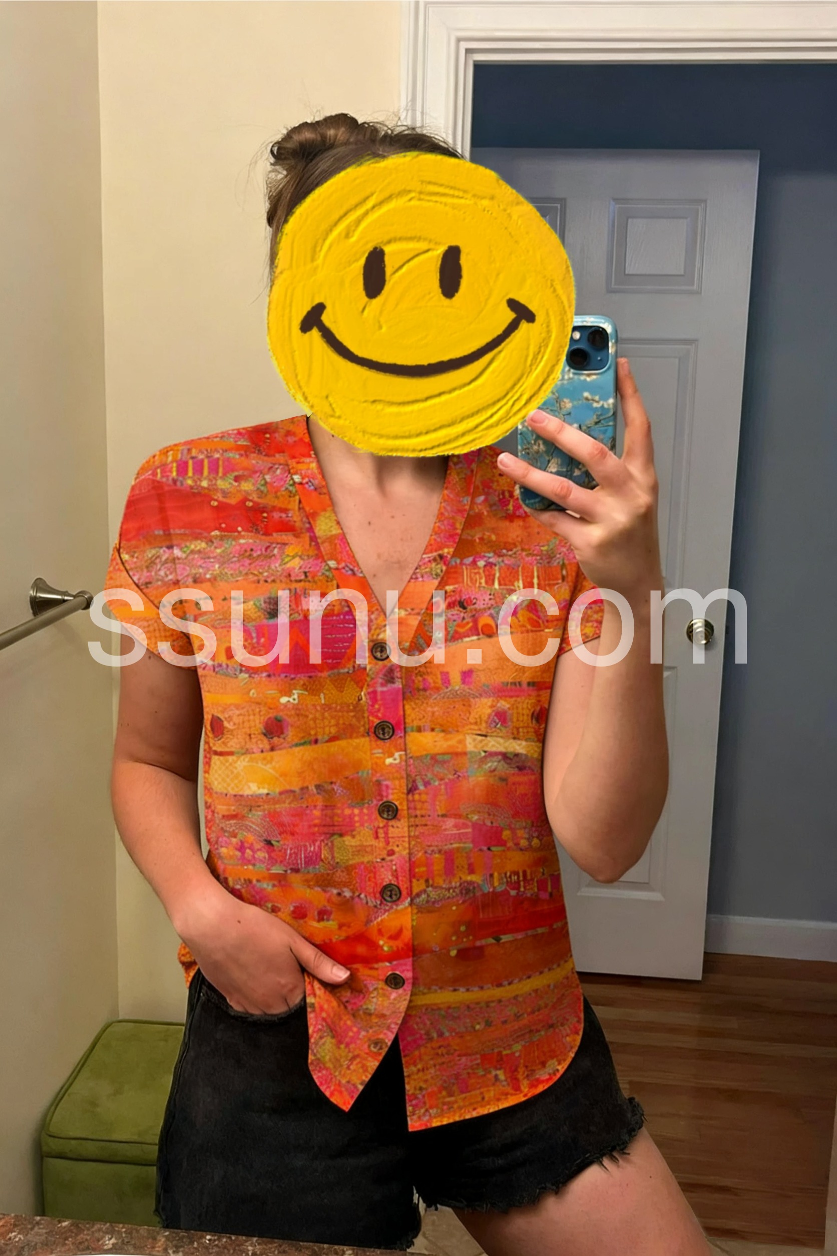 This short-sleeve button-up blouse features a lively orange and pink abstract pattern. The V-neck design adds a touch of elegance. Lightweight fabric for comfort and breathability. Perfect for making a statement in casual or boho outfits. Pair with jeans or trousers for effortless style.