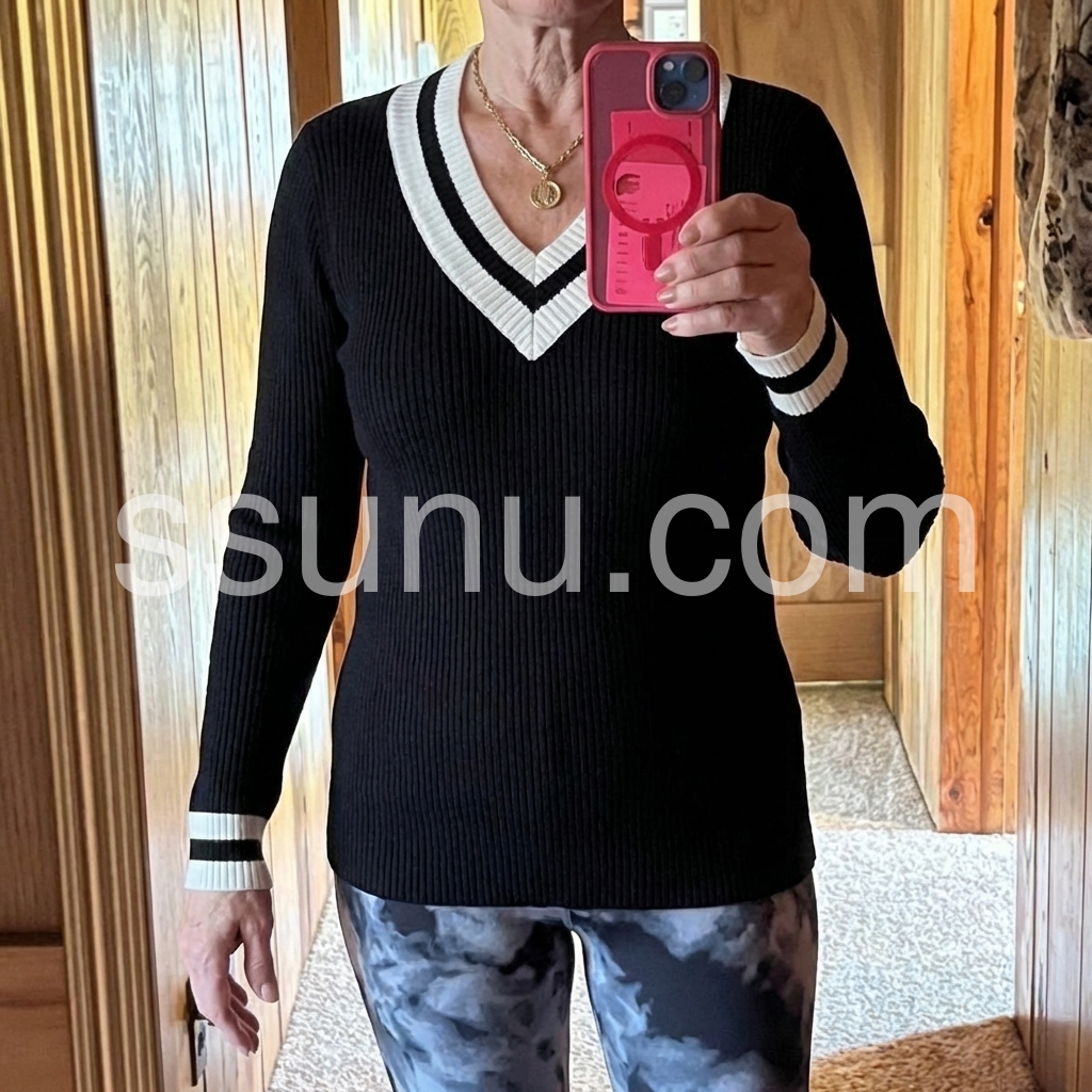 I’m obsessed with this design! The contrasting stripes at the collar, cuffs, and hem give it such a chic, timeless vibe without looking overly busy. The fit feels smooth and well-shaped, and the long sleeves are perfect for cooler weather. I also appreciate how the sweater holds its form after wearing, so it doesn’t look messy. It’s become one of my go-to pieces already.
