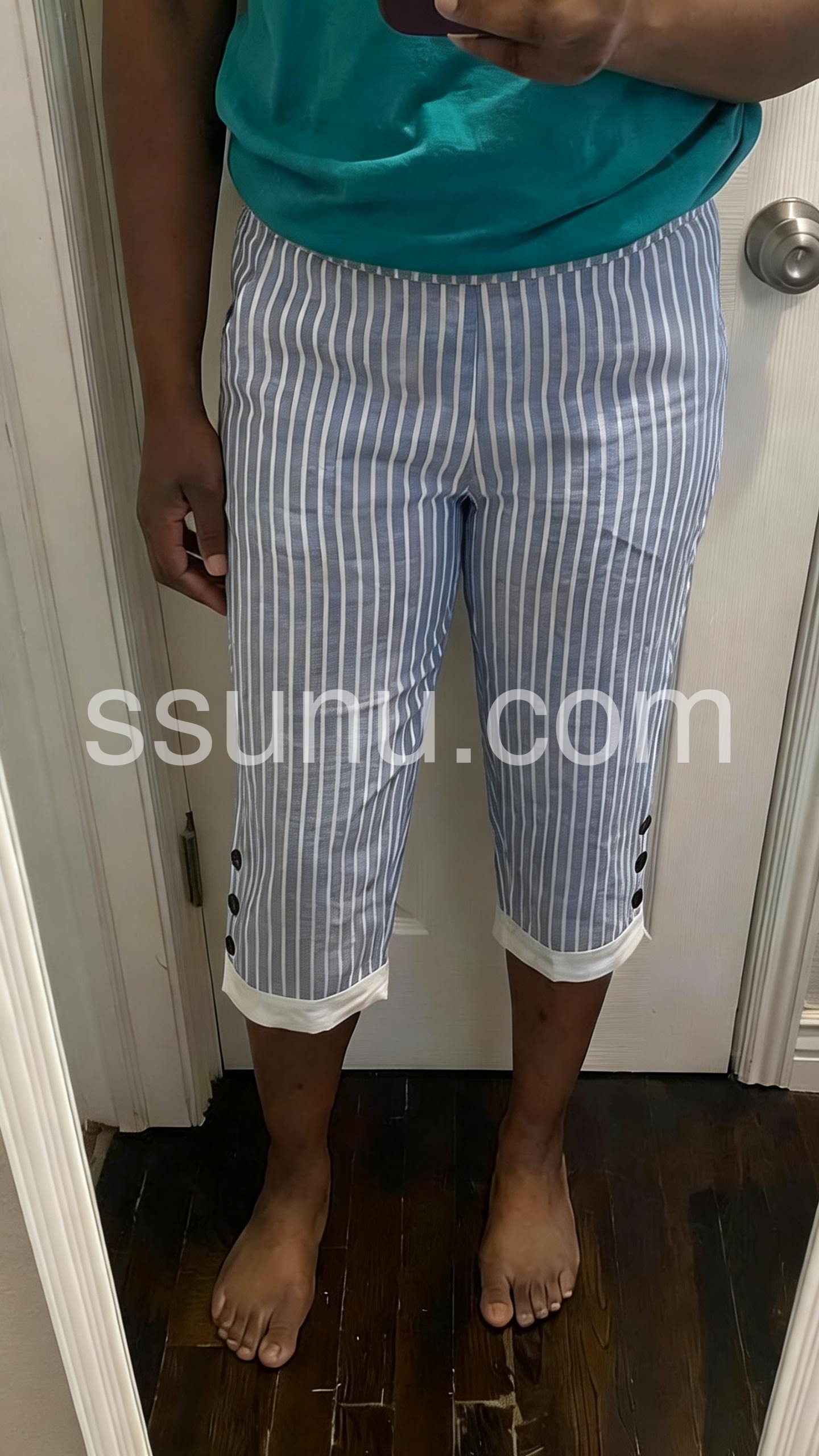 These mid-length capris feature vertical blue and white stripes with a relaxed fit. Side pockets and button details add practical style. Cuffed hems and elastic waistband for comfort. Lightweight fabric perfect for warm weather. Ideal for casual walks or beach days.
