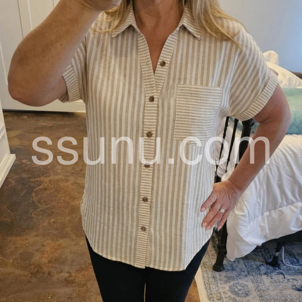 This short-sleeve shirt features vertical brown and white stripes with a classic collar. Front button closure and chest pocket add practical style. Soft, lightweight fabric for all-day comfort. Perfect for casual wear or layering. Effortlessly chic and easy to pair.